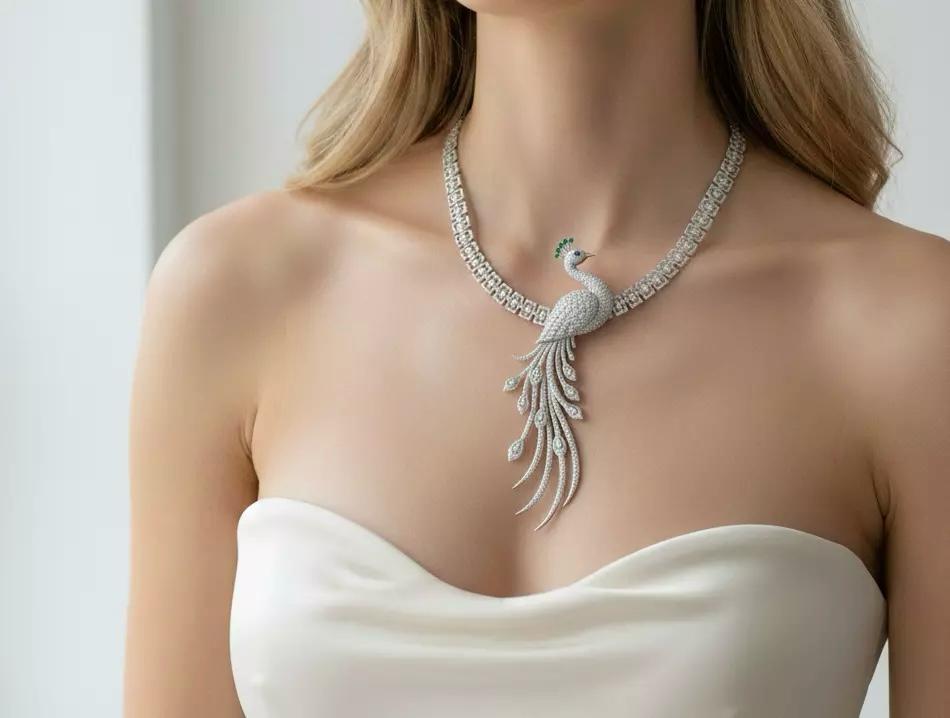 Beautiful Peacock Necklace in Sterling Silver. Fine Quality Peacock Necklace made with sterling Silver and Studded with Moissanite for Diamond Like Shine.